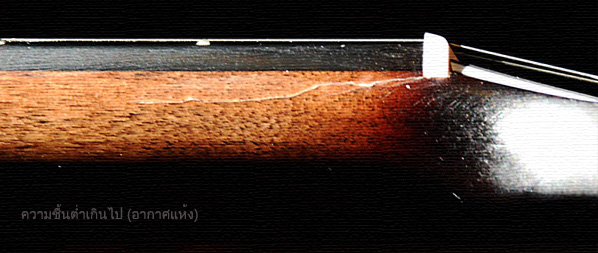 โดยเฉพาะไม้หน้า(top) จะเกิดอาการยกตัวหรือโก่งขึ้น ส่งผลให้ Action สูงขึ้น ให้ดูที่ Fret 12 จะเห็นชัดเจน